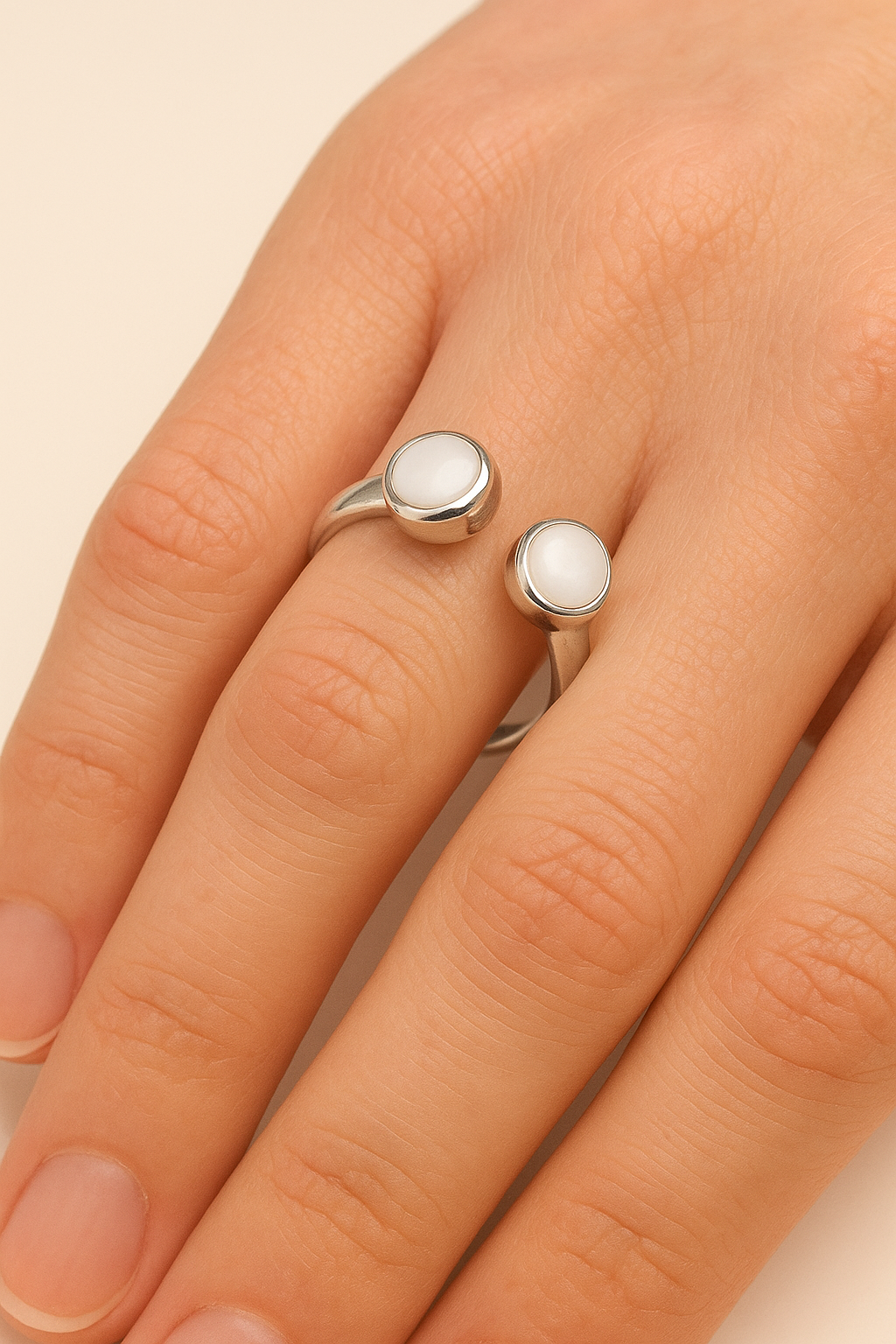 ANEL ABERTO AJUSTAVEL COM DUAS MADREPEROLAS REDONDAS EM BANHO DE RODIO BRANCO