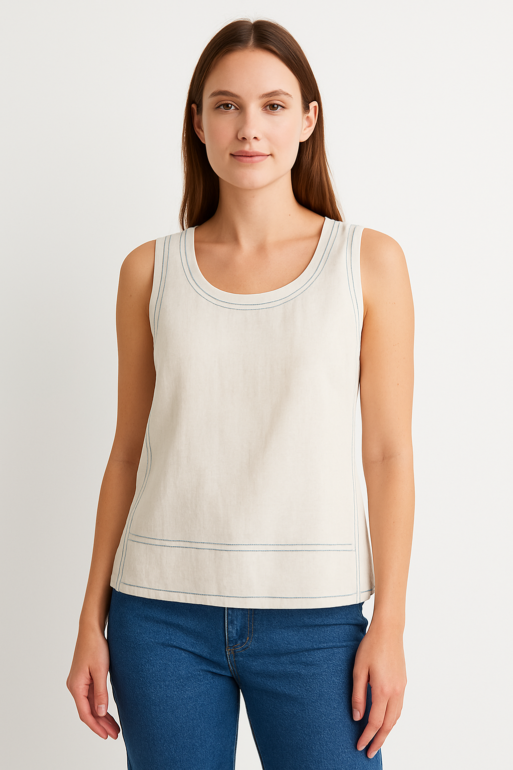BLUSA CAVADA LINHO PESPONTADA EM AZUL LINHO CRU