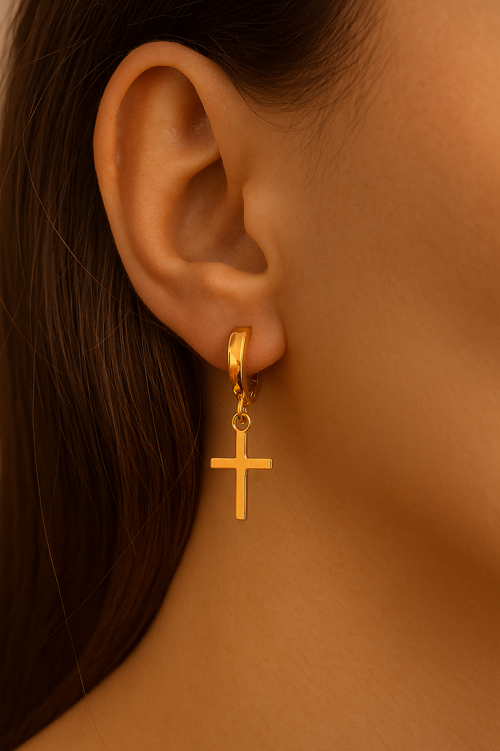 BRINCO ARGOLINHA COM PINGENTE CRUZ BANHO OURO