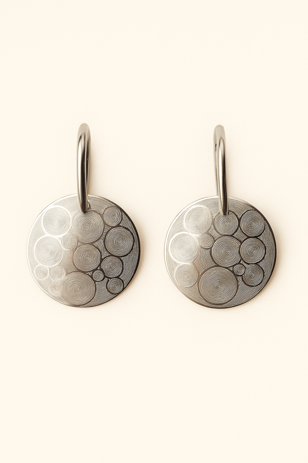 BRINCO BASE CURVADA COM PINGENTE CHAPA REDONDA TRABALHADA AÇO INOX