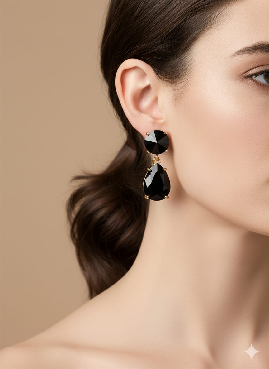 BRINCO BASE REDONDA E PINGENTE GOTA ZIRCONIAS PRETAS BANHO OURO