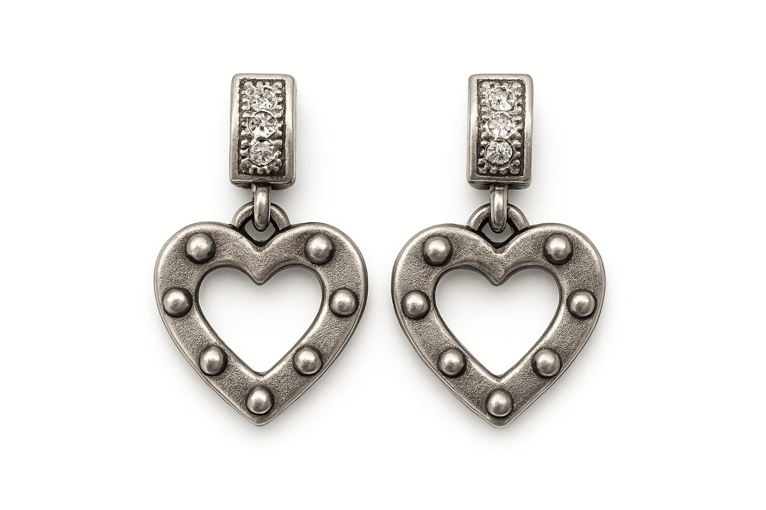 BRINCO CORAÇÃO PONTILHADO COM BASE CRAVEJADA INSPIRAÇÃO BANHO OURO BRANCO