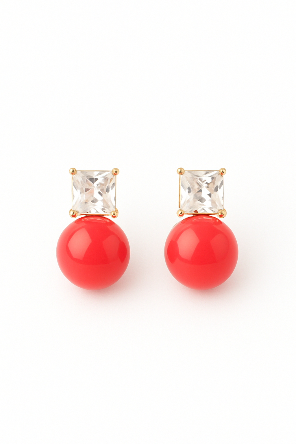 BRINCO OURO 18 K BASE UMA ZIRCONIA QUADRADA E UMA BOLINHA VERMELHA NA PONTA