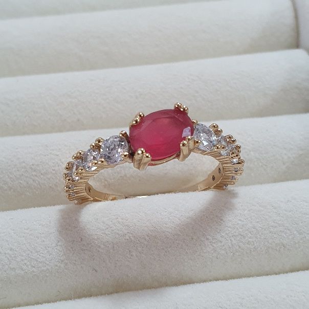 ANEL SOLITARIO PEDRA VERMELHA E LATERAIS CRAVEJADAS DE ZIRCONIAS EM BANHO DE OURO 18K