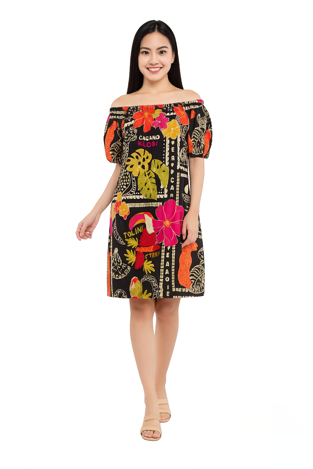 VESTIDO CURTO CIGANINHA COM MANGAS CURTAS ESTAMPADO PRETO E ROSA