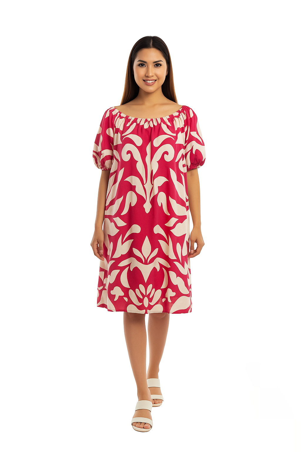 VESTIDO CURTO CIGANINHA COM MANGAS CURTAS ESTAMPADO ROSA E BEGE