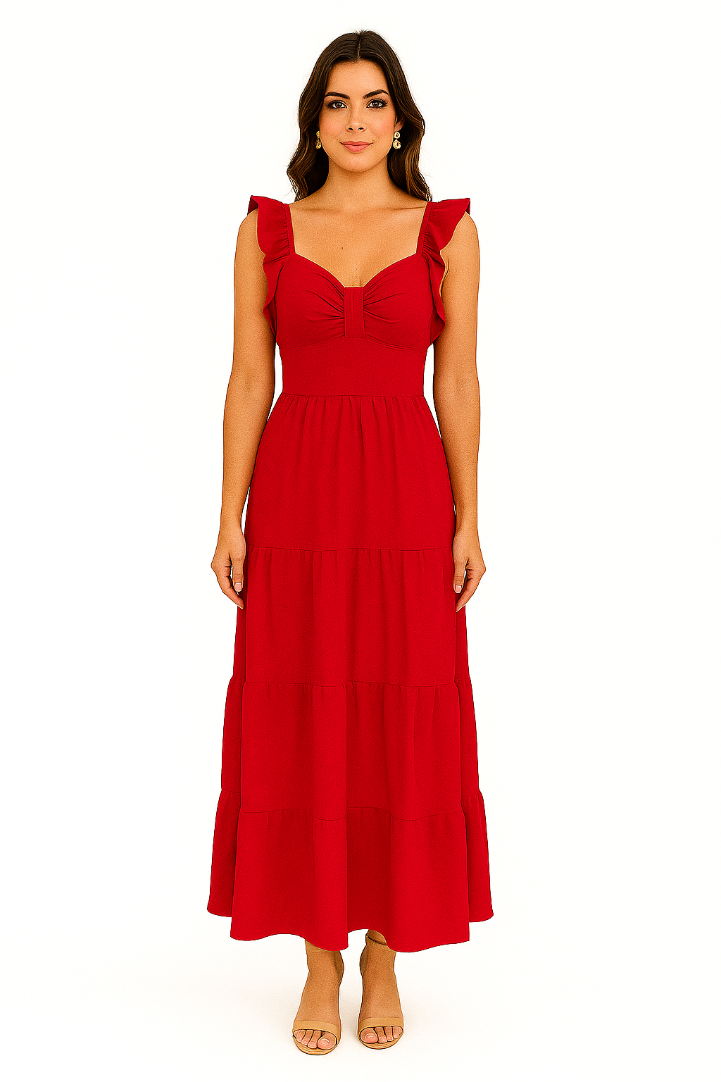 VESTIDO LONGO ALÇA BABADO TRES MARIAS ELASTICO NAS COSTAS VERMELHO