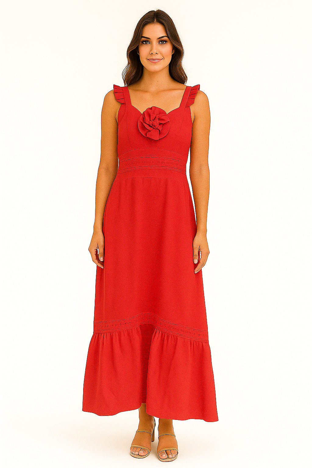 VESTIDO MIDI UMA MARIA ALÇA COM BABADO E FLOR OPCIONAL VERMELHO