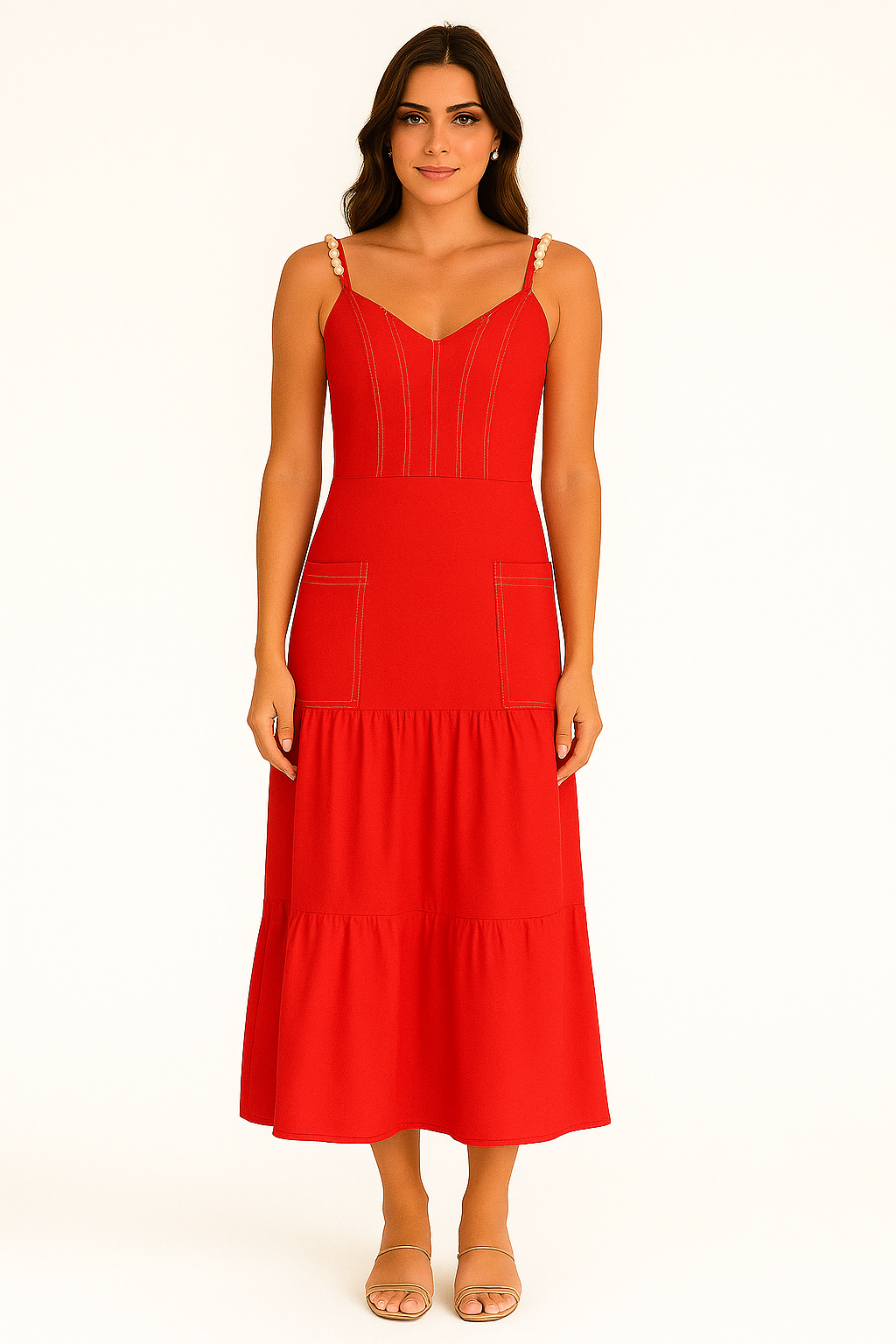 VESTIDO MIDI UMA MARIA ALÇA COM PEROLAS E CORPO COM PESPONTOS VERMELHO