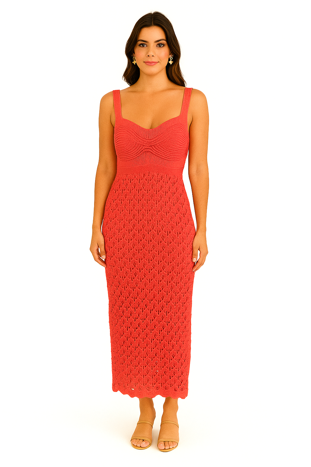 VESTIDO TRICO LONGO TRABALHADO FORRADO DE ALÇA LARGA VERMELHO